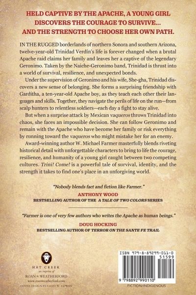 Held captive by the Apache, a young girl discovers the courage to survive... and the strength to choose her own path. In the rugged borderlands of northern Sonora and southern Arizona, twelve-year-old Trinidad Verdín's life is forever changed when a brutal Apache raid claims her family and leaves her a captive of the legendary Geronimo. Taken by the Naiche-Geronimo band, Trinidad is thrust into a world of survival, resilience, and unexpected bonds. Under the supervision of Geronimo and his wife, She-gha, Trinidad discovers a new sense of belonging. She forms a surprising friendship with Garditha, a ten-year-old Apache boy, as they teach each other their languages and skills. Together, they navigate the perils of life on the run-from scalp hunters to relentless soldiers-each day a fight to stay alive. But when a surprise attack by Mexican vaqueros throws Trinidad into chaos, she faces an impossible decision. She can follow Geronimo and remain with the Apache who have become her family or risk everything by running toward the vaqueros who might mistake her for an enemy. Award-winning author W. Michael Farmer masterfully blends riveting historical detail with unforgettable characters to bring to life the courage, resilience, and humanity of a young girl caught between two competing cultures. Trini! Come! is a powerful tale of survival, identity, and the strength it takes to find one's place in an unforgiving world.