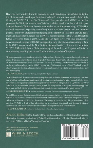 Have you ever wondered how to maintain an understanding of monotheism in light of the Christian understanding of the triune Godhead? Have you ever wondered about the identity of ""YHWH"" in the Old Testament? Have you identified YHWH as the first person of the Trinity as many in the Christian tradition have? If so, this book is for you. Many of the early Trinitarian heresies stemmed from a misunderstanding of YHWH in the Old Testament, especially identifying YHWH as one person and not multiple persons. This book addresses issues relating to the identity of YHWH in the Old Testament and makes the bold claim that YHWH is multiple persons in the OT and therefore, Father is YHWH, Jesus is YHWH, and the Holy Spirit is YHWH. This conclusion is based on sound exegesis of OT/NT passages, the early Christian understanding of God in the Old Testament, and the New Testament's identification of Jesus in the identity of YHWH. If identified thus, a Christian reading of the entirety of Scripture will take on new meaning, resulting in a robust Trinitarian interpretation of Scripture.