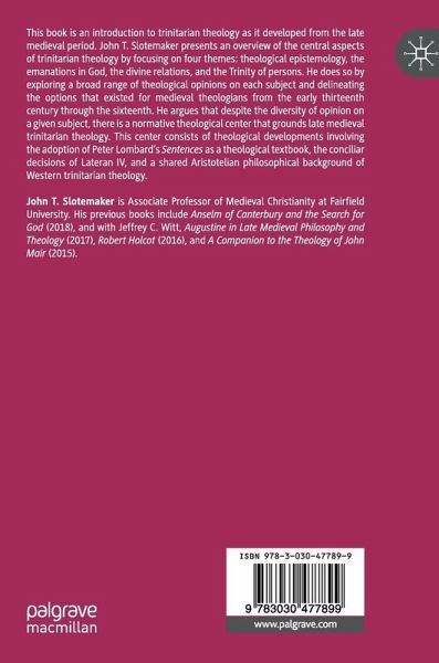 This book is an introduction to trinitarian theology as it developed from the late medieval period. John T. Slotemaker presents an overview of the central aspects of trinitarian theology by focusing on four themes: theological epistemology, the emanations in God, the divine relations, and the Trinity of persons. He does so by exploring a broad range of theological opinions on each subject and delineating the options that existed for medieval theologians from the early thirteenth century through the sixteenth. He argues that despite the diversity of opinion on a given subject, there is a normative theological center that grounds late medieval trinitarian theology. This center consists of theological developments involving the adoption of Peter Lombard's Sentences as a theological textbook, the conciliar decisions of Lateran IV, and a shared Aristotelian philosophical background of Western trinitarian theology.