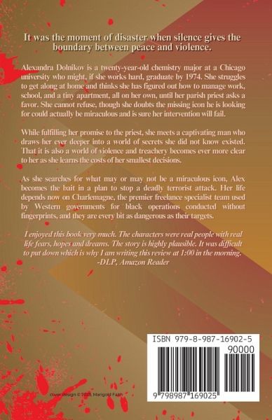 It was the moment of disaster when silence gives the boundary between peace and violence. Alexandra Dolnikov is a twenty-year-old chemistry major at a Chicago university who might, if she works hard, graduate by 1974. She struggles to get along at home and thinks she has figured out how to manage work, school, and a tiny apartment, all on her own, until her parish priest asks a favor. She cannot refuse, though she doubts that the missing icon he is looking for could be miraculous and is sure her intervention will fail. While fulfilling her promise to the priest, she meets a captivating man who draws her ever deeper into a world of secrets she did not know existed. That it is also a world of violence and treachery becomes ever more clear to her as she learns the costs of her smallest decisions. In her search for what may or may not be a miraculous icon, Alex becomes the bait in a plan to stop a deadly terrorist attack. Her life depends now on Charlemagne, the premier freelance specialist team used by Western governments for black operations conducted without fingerprints, and they are every bit as dangerous as their targets. Trinity Icon is the first novel in K.A. Bachus's fast-paced Charlemagne Files series chronicling the lives of a team of deadly Cold War intelligence operatives over a span of three decades.