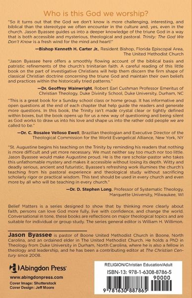 Most people assume they know what they mean when they use the word "God." They mean a powerful old guy in the sky ready to obliterate us if we do wrong but basically benevolent, if a little senile. The Christian doctrine of the Trinity shows us God is vastly more interesting. God is actually fleshed among us in Jesus, poured out on us in the Holy Spirit's intoxication of the church. God is three divine persons in perfect harmony and beauty--and God invites us into that unimaginable intimacy. We don't know this God, but we should. Trinity uses scripture, the Early Church tradition, and some modern theology to argue that God is a mystery whom we can't understand but who can shape our misunderstanding to allow for faithful living and holy love of God and neighbor. "Jason Byassee thinks like a theologian, writes like a journalist, and communicates like a storyteller. We live in a time of trinitarian dissonance, when the central doctrine of the Christian faith is strangely neglected by most Christians. Byassee's wonderful exploration of the Trinity offers a remedy for that by providing a meat-and-potatoes introduction to the God who is at once Father, Son, and Holy Spirit. An excellent spiritual guide for both mature Christians and those brand new to the Christian faith." --Rev. Dr. Andrew C. Thompson, Assistant Professor of Historical Theology &Wesleyan Studies, Memphis Theological Seminary, Memphis, TN, and Wesley Scholar for the Arkansas Conference of the United Methodist Church "In trying to communicate the trinitarian relationship, Byassee succeeds in making the indescribable a little more coherent while reminding us of the all-consuming love of God. Trinity is a little book of rigorous thought and deep devotion. It is rare these days to find a work of theology that stirs the intellect, the heart, and the spirit. And I have to admit, in reading this book, I fell in love with the Holy Spirit all over again." --Enuma Okoro, Nigerian-American writer, speaker, and award-winning author of Reluctant Pilgrim, Silence, and Common Prayer: A Liturgy for Ordinary Radicals