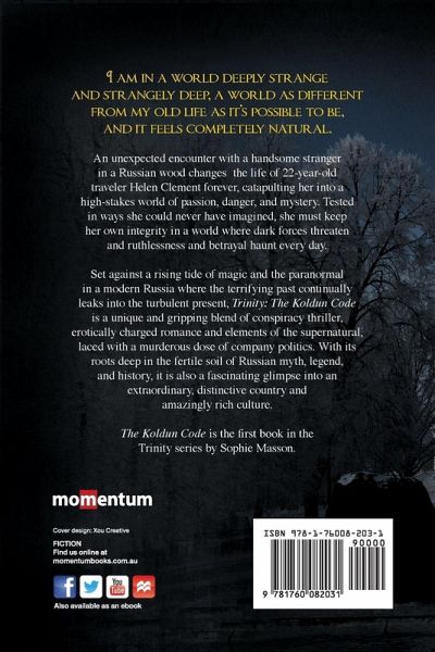 I am in a world deeply strange and strangely deep, a world as different from my old life as it's possible to be, and it feels completely natural. An unexpected encounter with a handsome stranger in a Russian wood changes the life of 22-year-old traveler Helen Clement forever, catapulting her into a high-stakes world of passion, danger, and mystery. Tested in ways she could never have imagined, she must keep her own integrity in a world where dark forces threaten and ruthlessness and betrayal haunt every day. Set against a rising tide of magic and the paranormal in a modern Russia where the terrifying past continually leaks into the turbulent present, Trinity is a unique and gripping blend of conspiracy thriller, erotically charged romance and elements of the supernatural, laced with a murderous dose of company politics. With its roots deep in the fertile soil of Russian myth, legend, and history, it is also a fascinating glimpse into an extraordinary, distinctive country and amazingly rich culture.
