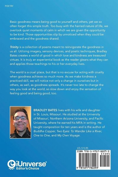 Basic goodness means being good to yourself and others, yet we so often forget this simple truth. Too busy with the harried nature of life, we overlook quiet moments of calm in which we are given the opportunity to be kind. Those opportunities slip by unnoticed when they could be embraced and the goodness shared. Trinity is a collection of poems meant to reinvigorate the goodness in us all. Utilizing imagery, sensory devices, and poetic techniques, Bradley Bates creates a world of good in which love and kindness are treasured virtues. It is truly an experiential book as the reader gleans what they can and applies those teachings to his or her everyday lives. The world is a cruel place, but that is no excuse for acting with cruelty when goodness achieves so much more. As we make kindness a practiced skill, we will notice not only a change in ourselves but in others, as well, as goodness spreads. It's never too late to change the way you look at the world, so slow down and enjoy the sensation of feeling good and being good, too.