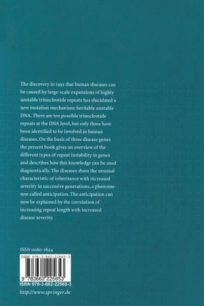 Till recently, mutations in genes were described in textbooks as deletions or point mutations. These mutations can be inherited from a parent or they are de novo alterations. The discovery in 1991 that human disease can be caused by large-scale ex pansion of highly unstable trinucleotide repeats has elucidated a new mutation mechanism, heritable unstable DNA. In the subsequent years more then 10 such disease genes have been identified. All dynamic mutations have been iden tified in neurological disorders. There are ten possible trinucleotide repeats at the DNA level, but only 3 have been identified as being involved in human dis eases. The rather frequent occurence of triplet repeats in the human genome indicates that other loci subject to unstable expansions may be discovered. The identification of repeat instability and the identification of disease genes containing trinucleotide repeats has helped to answer intriguing questions. The diseases share the unusual characteristic ofinheritance with increased disease severity in successive gernerations, a phenomenon called anticipation. Trinu cleotide repeat diseases are ideal subjects for direct testing because the muta tion is almost exclusively of the same type and there is an extremely low occur ance of new mutations in these diseases. The anticipation can now be explained by the correlation of increasing repeat length with increased disease serverity. It can be speculated that other neurological disorders showing anticipation will be caused by unstable repeats as well.