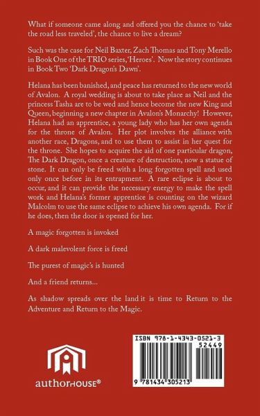 What if someone came along and offered you the chance to 'take the road less traveled', the chance to live a dream? Such was the case for Neil Baxter, Zach Thomas and Tony Merello in Book One of the TRIO series, 'Heroes'. Now the story continues in Book Two 'Dark Dragon's Dawn'. Helana has been banished, and peace has returned to the new world of Avalon. A royal wedding is about to take place as Neil and the princess Tasha are to be wed and hence become the new King and Queen, beginning a new chapter in Avalon's Monarchy! However, Helana had an apprentice, a young lady who has her own agenda for the throne of Avalon. Her plot involves the alliance with another race, Dragons, and to use them to assist in her quest for the throne. She hopes to acquire the aid of one particular dragon, The Dark Dragon, once a creature of destruction, now a statue of stone. It can only be freed with a long forgotten spell and used only once before in its entrapment. A rare eclipse is about to occur, and it can provide the necessary energy to make the spell work and Helana's former apprentice is counting on the wizard Malcolm to use the same eclipse to achieve his own agenda. For if he does, then the door is opened for her. A magic forgotten is invoked A dark malevolent force is freed The purest of magic's is hunted And a friend returns... As shadow spreads over the land it is time to Return to the Adventure and Return to the Magic.