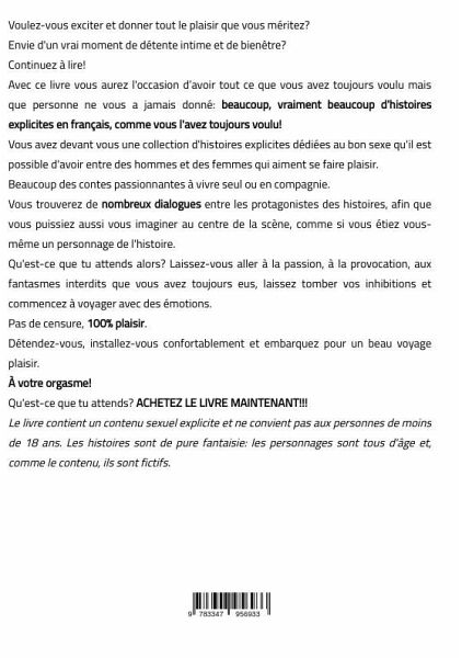 Voulez-vous exciter et donner tout le plaisir que vous méritez?Envie d'un vrai moment de détente intime et de bienêtre?Continuez à lire!Avec ce livre vous aurez l'occasion d'avoir tout ce que vous avez toujours voulu mais que personne ne vous a jamais donné: beaucoup, vraiment beaucoup d'histoires explicites en français, comme vous l'avez toujours voulu!Vous avez devant vous une collection d'histoires explicites dédiées au bon sexe qu'il est possible d'avoir entre des hommes et des femmes qui aiment se faire plaisir. Beaucoup des contes passionnantes à vivre seul ou en compagnie.Vous trouverez de nombreux dialogues entre les protagonistes des histoires, afin que vous puissiez aussi vous imaginer au centre de la scène, comme si vous étiez vous-même un personnage de l'histoire.Qu'est-ce que tu attends alors? Laissez-vous aller à la passion, à la provocation, aux fantasmes interdits que vous avez toujours eus, laissez tomber vos inhibitions et commencez à voyager avec des émotions.Pas de censure, 100 pour 100 de plaisir.Détendez-vous, installez-vous confortablement et embarquez pour un beau voyage plaisir.À votre orgasme!