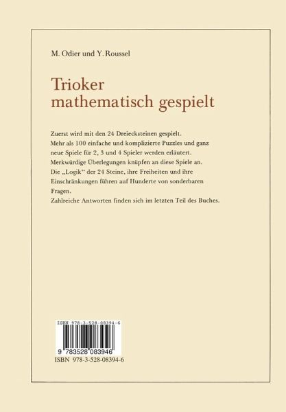 1 Vorwort.- 2 Die 24 logischen Steine.- 3 Puzzles und Formen.- A Ganz einfache Puzzles.- B Einfache Puzzles.- C Schwierige Puzzles.- D Erste Puzzles mit 24 Steinen.- E Eine erste Freiheit.- F Eine zweite Freiheit.- G Zwei Freiheiten gleichzeitig.- H Einschränkungen.- I Verfeinerte Einschränkungen.- K Einander ergänzende Freiheiten und Einschränkungen.- L Puzzles, die besonders schwierig sind.- M Das Riesensechseck.- 4 Gesellschaftsspiele.- A Einfache Spiele.- B Das symmetrische Duell.- C Spiel für N Spieler.- 5 Erste Übungen und Fragestellungen.- A Zuerst einige Übungen, die rasch erledigt sind.- B Einiges zum Sechseck.- C Wozu die Gleichheit dient.- D Beschreibung der Steine durch Fragespiele.- E Erste Zuordnungen.- F Drei Pfeiltypen.- G Zweier-Puzzles und ihre Darstellungen.- H Dreier-Puzzles, Vierer-Puzzles, N-Puzzles.- 6 Weitere Überlegungen und Übungen.- A Definition der Spielsteine.- B Anzahl der Spielsteine.- C Logische Anordnung der Spielsteine.- D Bezeichnung der Spielsteine.- E Systematik der Puzzles zur Wiederholung.- F Blumen mit der Zahl 3.- 7 Voll durchdachte Puzzlebeispiele.- A Logische Puzzles.- B Puzzles mit 4 ausgewählten Steinen.- C Puzzles mit 6 ausgewählten Steinen.- D Puzzles mit 8 ausgewählten Steinen.- E Puzzles mit 10 ausgewählten Steinen.- F Puzzles mit 11 ausgewählten Steinen.- G Puzzles mit 12 ausgewählten Steinen.- H Puzzles mit 13 ausgewählten Steinen.- I Puzzles mit mehr als 13 Steinen.- 8 Eine Fundgrube für Beispiele (und Puzzles...).- Liste 1.- Liste 2.- 9 Auffinden der Gesetze.- 10 Trioker auf Polyedern.- A (Einteilung).- B Konstruktion von Polyedern.- C Überdeckung durch gleichseitige Dreiecke.- D Der regelmäßige Tetraeder.- E Der Oktaeder.- F Der Ikosaeder.- G Drei andere Fragen zu den regelmäßigen Polyedern.- HUnregelmäßige Polyeder.- I Die konvexen Dekaeder.- K Antiprismen.- L Nicht-konvexe Polyeder.- M Netze und Abwicklungen.- N Zum Abschluß dieses Kapitels.- 11 Mini-, Maxi-, Super-Trioker.- A Wenn W = 3: Mini-Trioker.- B Wenn W = 4.- C Wenn W = 5: Maxi-Trioker mit 45 Elementen.- D Wenn W = 6: Super-Trioker mit 76 Elementen.- 12 Doppel-Trioker, dann Dreifach-Trioker und dann.- A Zwei Mini-Trio ker.- B Doppel-Trioker.- C Dreifach-Trioker.- D Eine schwere Frage.- 13 Das Anti-Trioker.- 14 Neue Anregungen.- A Kodierung und Umbenennung der Steine.- B Allgemeines zu "Darstellungen".- C Symmetrien der Steine und Puzzles.- D Aufzählung der Formen von N-Steinen.- E Beschreibung der Formen durch ihren Umriß.- F Einige Worte zum Computer.- 15 Andere Formen anstelle des gleichseitigen Dreieckes.- A Ungleichseitige Dreiecke.- B Vierecke.- C Steine mit 5 Bewertungspunkten.- D Steine mit 6 Bewertungspunkten.- E Steine, die 7 Bewertungspunkte aufweisen.- F "Umkehrbare" Steine.- G Und im Raum?.- 16 Anwendungen.- Für Physiker.- Für Rätselfreunde.- Für Zahlentheoretiker.- Für Architekten.- Für Mikrobiologen.- Für Pharmakologen.- Für Virologen.- Für Atomforscher.- Für Arithmetiker.- Für Geometer.- Für Wahrscheinlichkeitstheoretiker.- Für Elektrotechniker.- Für Chemiker.- Für Raumtheoretiker.- Für Mineralogen.- Für Topologen.- Für Organiker.- Für Künstler.- Für Kristallographien.- 17 Lösungen.- Lösungen zu Kapitel 3.- Lösungen zu Kapitel 4.- Lösungen zu Kapitel 5.- Lösungen zu Kapitel 6.- Lösungen zu Kapitel 7.- Lösungen zu Kapitel 8.- Lösungen zu Kapitel 9.- Lösungen zu Kapitel 10.- Lösungen zu Kapitel 11.- Lösungen zu Kapitel 12.- Lösungen zu Kapitel 13.- Lösungen zu Kapitel 14.- Lösungen zu Kapitel 15.- Lösungen zu Kapitel 16.-Literaturnachweis.- Gitter-Tafel.- Spielplan.