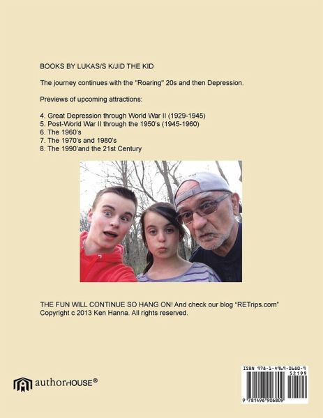 BOOKS BY LUKAS/S K/JID THE KID The journey continues with the "Roaring" 20s and then Depression. Previews of upcoming attractions: 4. Great Depression through World War II (1929-1945) 5. Post-World War II through the 1950's (1945-1960) 6. The 1960's 7. The 1970's and 1980's 8. The 1990'and the 21st Century THE FUN WILL CONTINUE SO HANG ON! And check our blog "RETrips.com" Copyright c 2013 Ken Hanna. All rights reserved.
