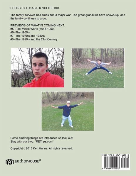 BOOKS BY LUKAS/S.K./JID THE KID The family survives bad times and a major war. The great-grandkids have shown up, and the family continues to grow. PREVIEWS OF WHAT IS COMING NEXT: #5--Post World War II (1945-1959) #6--The 1960's #7--The 1970's and 1980's #8--The 1990's and the 21st Century Some amazing things are introduced so look out! Stay with our blog: "RETrips.com" Copyright c 2013 Ken Hanna. All rights reserved.