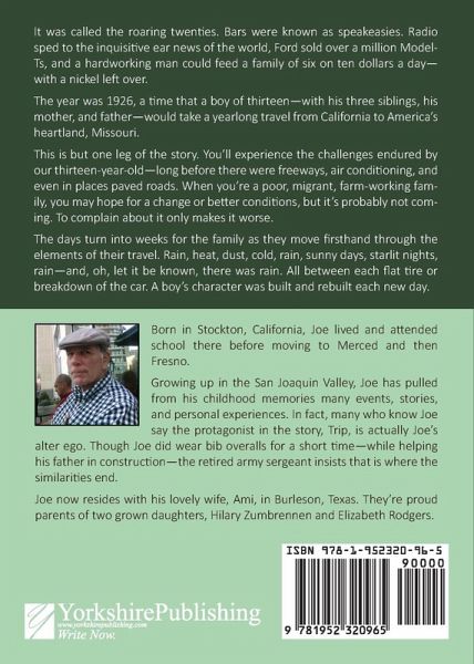 It was called the roaring twenties. Bars were known as speakeasies. Radio sped to the inquisitive ear news of the world, Ford sold over a million Model-Ts, and a hardworking man could feed a family of six on ten dollars a day - with a nickel left over. The year was 1926, a time that a boy of thirteen - with his three siblings, his mother, and father - would take a yearlong travel from California to America's heartland, Missouri. This is but one leg of the story. You'll experience the challenges endured by our thirteen-year-old-long before there were freeways, air conditioning, and even in places paved roads. When you're a poor, migrant, farm-working family, you may hope for a change or better conditions, but it's probably not coming. To complain about it only makes it worse. The days turn into weeks for the family as they move firsthand through the elements of their travel. Rain, heat, dust, cold, rain, sunny days, starlit nights, rain - and, oh, let it be known, there was rain. All between each flat tire or breakdown of the car. A boy's character was built and rebuilt each new day.