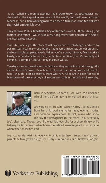 It was called the roaring twenties. Bars were known as speakeasies. Radio sped to the inquisitive ear news of the world, Ford sold over a million Model-Ts, and a hardworking man could feed a family of six on ten dollars a day - with a nickel left over. The year was 1926, a time that a boy of thirteen - with his three siblings, his mother, and father - would take a yearlong travel from California to America's heartland, Missouri. This is but one leg of the story. You'll experience the challenges endured by our thirteen-year-old-long before there were freeways, air conditioning, and even in places paved roads. When you're a poor, migrant, farm-working family, you may hope for a change or better conditions, but it's probably not coming. To complain about it only makes it worse. The days turn into weeks for the family as they move firsthand through the elements of their travel. Rain, heat, dust, cold, rain, sunny days, starlit nights, rain - and, oh, let it be known, there was rain. All between each flat tire or breakdown of the car. A boy's character was built and rebuilt each new day.