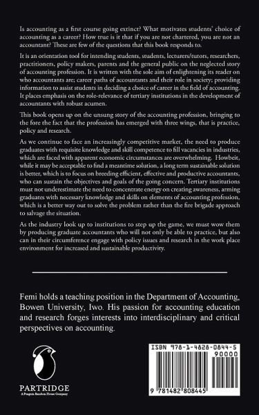 Is accounting as a first course going extinct? What motivates students' choice of accounting as a career? How true is it that if you are not chartered, you are not an accountant? These are few of the questions that this book responds to. It is an orientation tool for intending students, students, lecturers/tutors, researchers, practitioners, policy makers, parents and the general public on the neglected story of accounting profession. It is written with the sole aim of enlightening its reader on who accountants are; career paths of accountants and their role in society; providing information to assist students in deciding a choice of career in the field of accounting. It places emphasis on the role-relevance of tertiary institutions in the development of accountants with robust acumen. This book opens up on the unsung story of the accounting profession, bringing to the fore the fact that the profession has emerged with three wings, that is practice, policy and research. As we continue to face an increasingly competitive market, the need to produce graduates with requisite knowledge and skill competence to fill vacancies in industries, which are faced with apparent economic circumstances are overwhelming. Howbeit, while it may be acceptable to find a meantime solution, a long term sustainable solution is better, which is to focus on breeding efficient, effective and productive accountants, who can sustain the objectives and goals of the going concern. Tertiary institutions must not underestimate the need to concentrate energy on creating awareness, arming graduates with necessary knowledge and skills on elements of accounting profession, which is a better way out to solve the problem rather than the fire brigade approach to salvage the situation. As the industry look up to institutions to step up the game, we must wow them by producing graduate accountants who will not only be able to practice, but also can in their circumference engage with policy issues and research in the work place environment for increased and sustainable productivity.