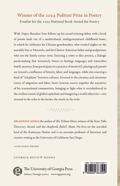 With Tripas, Brandon Som follows up his award-winning debut with a book of poems built out of a multicultural, multigenerational childhood home, in which he celebrates his Chicana grandmother, who worked nights on the assembly line at Motorola, and his Chinese American father and grandparents, who ran the family corner store.