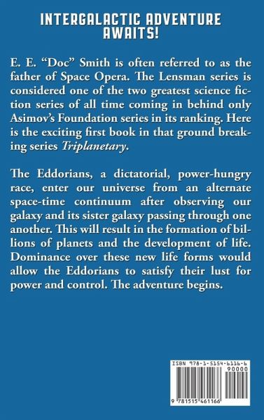 Intergalactic Adventure Awaits. E. E. "Doc" Smith is often referred to as the father of Space Opera. The Lensman series is considered one of the two greatest science fiction series of all time coming in behind only Asimov's Foundation series in its ranking. Here is the exciting first book in that ground breaking series Triplanetary. The Eddorians, a dictatorial, power-hungry race, enter our universe from an alternate space-time continuum after observing our galaxy and its sister galaxy passing through one another. This will result in the formation of billions of planets and the development of life. Dominance over these new life forms would allow the Eddorians to satisfy their lust for power and control. The adventure begins.