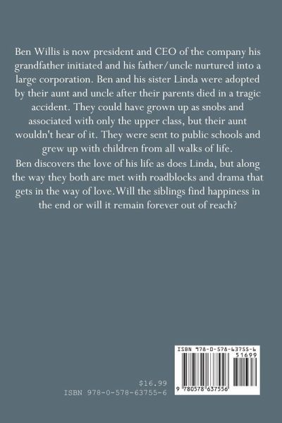 Ben Willis is now president and CEO of the company his grandfather initiated and his father/uncle nurtured into a large corporation. After Ben's aunt and uncle adopted Ben and his sister Linda when they were five and three years-old, respectively. They could have grown up as snobs and associated with only the upper class, but their aunt wouldn't hear of it. They were sent to public schools and grew up with children from all walks of life. Ben discovers the love of his life as does Linda, but along the way they both are met with roadblocks and drama that gets in the way of love.Will the siblings find happiness in the end or will it remain forever out of reach?