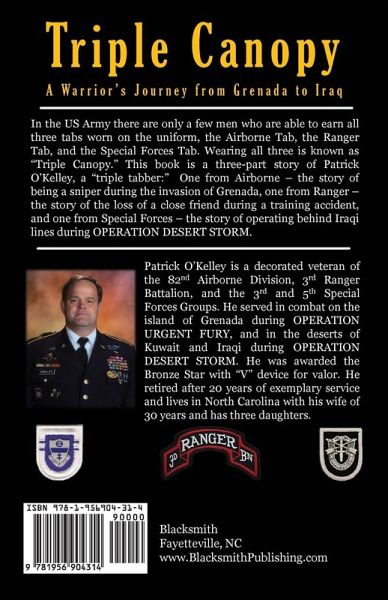In the US Army there are only a few men able to earn all three Army Tabs worn on the military uniform; the Airborne Tab, the Ranger Tab and the Special Forces Tab. Those men are known by many terms, but one of the terms is "Triple Canopy". This book is comprised of three stories from the journey of Patrick O'Kelley, a "triple tabber". The first story is from his time spent as a Paratrooper in the Airborne - of serving as a sniper during the invasion of the island of Grenada. The next story is from his time as an Airborne Ranger - it focuses on the loss of a close friend during a training accident. The final story is from his time spent as a Green Beret in the Special Forces - of operating behind Iraqi lines during Operation Desert Storm. These stories come from the ground level, from an actual warrior serving at the "tip of the spear" with other warriors. If you enjoy unfiltered truth, told by an actual participant, then Triple Canopy is a must read for any and all warriors.