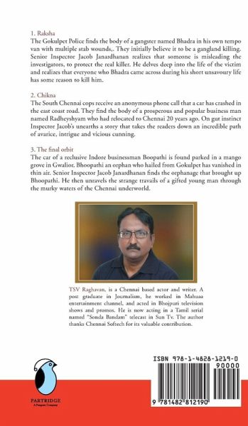 1. Raksha The Gokulpet police finds the body of a gangster named Bhadra in his own tempo van with multiple stab wounds. They initially believe it to be a gangland killing. Senior Inspector Jacob Janardhanan realizes that someone is misleading the investigators to protect the real killer. He delves deep into the life of the victim and realizes that everyone who Bhadra came across during his short unsavoury life has some reason to kill him. 2. Chikna The South Chennai cops receive an anonymous phone call that a car has crashed in the east-coast road. They find the body of a prosperous and popular businessman named Radheyshyam, who had relocated to Chennai twenty years ago. On gut instinct, Inspector Jacob’s unearths a story that takes the readers down an incredible path of avarice, intrigue, and vicious cunning. 3. The Final Orbit The car of a reclusive Indore businessman Boopathi is found parked in a mango grove in Gwalior. Bhoopathi, an orphan who hailed from Gokulpet, has vanished in thin air. Senior Inspector Jacob Janardhanan finds the orphanage that brought up Bhoopathi. He then unravels the strange travails of a gifted young man through the murky waters of the Chennai underworld.