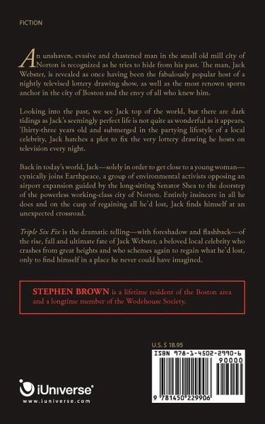 An unshaven, evasive and chastened man in the small old mill city of Norton is recognized as he tries to hide from his past. The man, Jack Webster, is revealed as once having been the fabulously popular host of a nightly televised lottery drawing show, as well as the most renown sports anchor in the city of Boston and the envy of all who knew him. Looking into the past, we see Jack top of the world, but there are dark tidings as Jack's seemingly perfect life is not quite as wonderful as it appears. Thirty-three years old and submerged in the partying lifestyle of a local celebrity, Jack hatches a scheme to fix the very lottery drawing he hosts on television every night. Back in today's world, Jack-solely in order to get close to a young woman-cynically joins Earthpeace, a group of environmental activists opposing an airport expansion guided by the long-sitting Senator Shea to the doorstep of the powerless working-class city of Norton. Entirely insincere in all he does and on the cusp of regaining all he'd lost, Jack finds himself at an unexpected crossroad. Triple Six Fix is the dramatic telling-with foreshadow and flashback-of the rise, fall and ultimate fate of Jack Webster, a beloved local celebrity who crashes from great heights and who schemes again to regain what he'd lost.