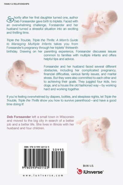 Shortly after her first daughter turned one, author Deb Forssander gave birth to triplets. Faced with an overwhelming challenge, Forssander and her husband turned a stressful situation into an exciting and thrilling time. Triple the Trouble, Triple the Thrills: A Mom's Guide to Managing Multiple Infants takes you from Forssander's pregnancy through her triplets' thirteenth birthday. Drawing on her parenting experience, Forssander discusses issues common to families with multiple infants and offers helpful tips and advice. Forssander and her husband faced several different obstacles, including her complicated pregnancy, financial difficulties, various family issues, and marital stress. But they were also committed to each other and to achieving their goals. They juggled four kids, two dogs, and a house the old fashioned way-by working hard and working together. If you're feeling overwhelmed by diapers, bottles, and sleepless nights, let Triple the Trouble, Triple the Thrills show you how to survive parenthood-and have a good time doing it!