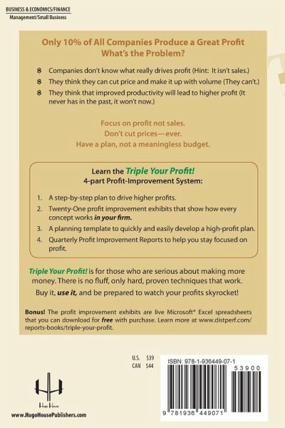 Only 10% of All Companies Produce a Great Profit What's the Problem? Companies don't know what really drives profit (Hint: It isn't sales.) They think they can cut price and make it up with volume (They can't.) They think that improved productivity will lead to higher profit (It never has in the past, it won't now.) How do you Triple your Profit? - Focus on profit not sales. - Don't cut prices-ever. - Have a plan, not a meaningless budget. "Triple Your Profit!" contains a 4-part Profit-Improvement System: A step-by-step plan to drive higher profits. Twenty-One profit improvement exhibits that show how every concept works in your firm. A planning template to quickly and easily develop a high-profit plan. Quarterly Profit Improvement Reports to help you stay focused on profit. "Triple Your Profit! is for those who are serious about making more money. There is no fluff, only hard, proven techniques that work. Buy it, use it, and be prepared to watch your profits skyrocket! Bonus!!! The profit improvement exhibits are live Microsoft® Excel spreadsheets that you can download for free with purchase. Learn more at www.distperf.com/reports-books/triple-your-profit..