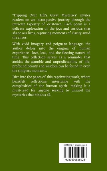 "Tripping Over Life's Great Mysteries" invites readers on an introspective journey through the intricate tapestry of existence. Each poem is a delicate exploration of the joys and sorrows that shape our lives, capturing moments of clarity amid the chaos. With vivid imagery and poignant language, the author delves into the enigma of human experience-love, loss, and the fleeting nature of time. This collection serves as a reminder that amidst the stumble and unpredictability of life, profound beauty and wisdom can be found in even the simplest moments. Dive into the pages of this captivating work, where heartfelt reflections intertwine with the complexities of the human spirit, making it a must-read for anyone seeking to unravel the mysteries that bind us all.