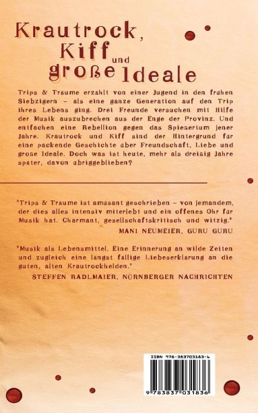 Trips & Träume erzählt die Geschichte einer Jugend in den frühen Siebzigern - als eine ganze Generation auf den Trip ging. Drei Freunde versuchen mit Hilfe der Musik auszubrechen aus der Enge der Provinz. Und entfachen eine Rebellion gegen das Spießertum jener zeit. Krautrock und Kiff sind der Hintergrund für eine packende Geschichte über Freundschaft, Liebe und große Ideale. Doch was ist heute, mehr als dreißig Jahre später davon übriggebrlieben?"Trips & Träume ist amüsant geschrieben - von jemandem, der dies alles intensiv miterlebt und ein offenes Ohr für Musik hat. Charmant, gesellschaftskrtisch und witzig" MANI NEUMEIER, GURU GURU"Musik als Lebensmittel. Eine Erinngerung an wilde Zeiten und zugleich eine längst fällige Liebeserklärung an die guten, alten Krautrockhelden." NÜRNBERGER NACHRICHTEN