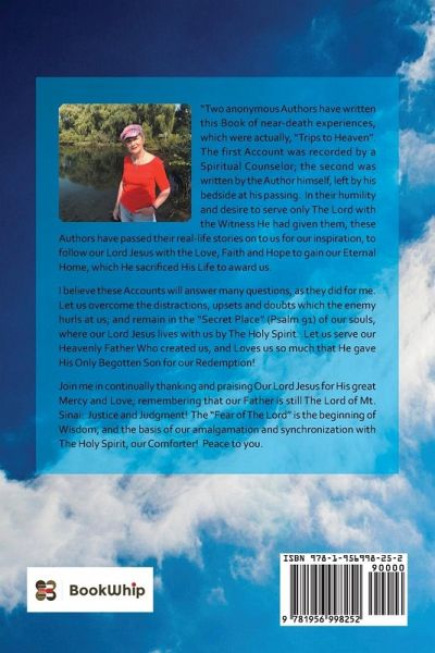 "Two anonymous Authors have written this Book of near-death experiences, which were actually, "Trips to Heaven''. The first Account was recorded by a Spiritual Counselor; the second was written by the Author himself, left by his bedside at his passing. In their humility and desire to serve only The Lord with the Witness He had given them, these Authors have passed their real-life stories on to us for our inspiration, to follow our Lord Jesus with the Love, Faith and Hope to gain our Eternal Home, which He sacrificed His Life to award us. I believe these Accounts will answer many questions, as they did for me. Let us overcome the distractions, upsets and doubts which the enemy hurls at us; and remain in the "Secret Place" (Psalm 91) of our souls, where our Lord Jesus lives with us by The Holy Spirit. Let us serve our Heavenly Father Who created us, and Loves us so much that He gave His Only Begotten Son for our Redemption! Join me in continually thanking and praising Our Lord Jesus for His great Mercy and Love; remembering that our Father is still The Lord of Mt. Sinai: Justice and Judgment! The "Fear of The Lord" is the beginning of Wisdom, and the basis of our amalgamation and synchronization with The Holy Spirit, our Comforter! Peace to you.