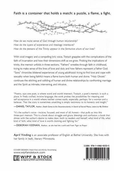 Faith is a container that holds a match: a puzzle, a flame, a fight. How do we make sense of God through human relationship? How do the layers of experience and theology interleave? How do the persons of the Trinity appear in the formative altars of our lives? With vivid imagery and a compelling lyric voice, Triptych grapples with the complications of the faith of incarnation and how their dimensions shift as we grow. Probing the implications of trinity, the memoir unfolds in three sections. ""Fathers"" wrestles through faith in childhood, trying to make sense of the lines of love and duty and how fathers represent a Father God. ""Sons"" chronicles blistered experiences of young adulthood: trying to find love and cope with sexuality when being faithful means a flame burns both human and divine. ""Holy Ghosts"" continues the stitching and colliding of human and divine relationships by confronting marriage and the Spirit as intimate, intervening, and intrusive.