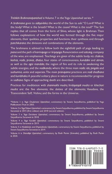 Trishikhi Brahmanopanishad is Volume 7 in the Yoga Upanishad series. * A brahmäa goes to aditya-loka, the world of the Sun to ask: "O Lord! What is the body? What is the breath? What is the cause? What is the soul?" The Sun replies that all comes from the form of ¿iva, whose light is Brahman. Then follows explanations of how the world was formed through the five major elements, their qualities, properties and functions, their synthesis and through pañcik¿räa, the divisions and combinations of the elements. The brahmäa is advised to follow both the eightfold path of yoga leading to jñ¿na and the path of karmayoga or kriy¿yoga. Renunciation and satsang, company of the wise, are emphasised. Teachings are given of the subtle body, viz. cakras, köas, n¿¿¿s,pr¿¿as, dhatus, four states of consciousness kü¿alin¿ and ¿tman as well as the agni mä¿ala, the region of fire and its role in awakening the subtle energies, and the n¿¿ikanda, where the three main n¿¿¿s, i¿¿ pi¿gal¿ and süumn¿, unite and separate. The main pr¿¿¿yama practices are n¿¿¿ ¿odhana and kumbhaka. A peaceful solitary place in nature is recommended for progress in s¿dhana. Signs of approaching death are described. Practices for meditation with ¿ämukh¿ mudr¿, h¿day¿ñjali mudr¿ or khecar¿ mudr¿ are: the five elements; the deities of the elements; V¿sudeva, the Transcendent Self; Vi¿¿u; and the forms in the Universe.