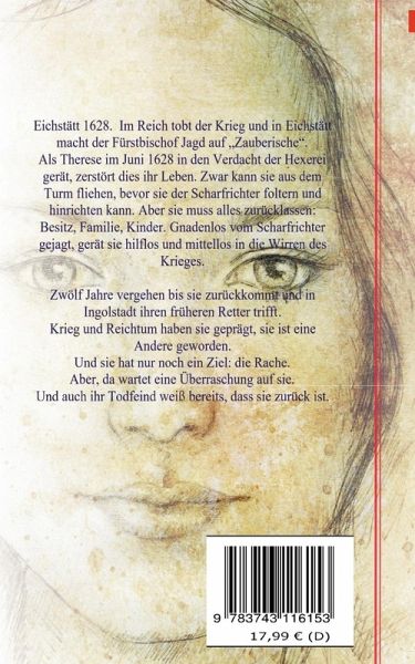 Eichstätt 1628. Im Reich tobt der Krieg und in Eichstätt macht der Fürstbischof Jagd auf "Zauberische".Als Therese im Juni 1628 in den Verdacht der Hexerei gerät, zerstört dies ihr Leben. Zwar kann sie aus dem Turm fliehen, bevor sie der Scharfrichter foltern und hinrichten kann. Aber sie muss alles zurücklassen: Besitz, Familie, Kinder. Gnadenlos vom Scharfrichter gejagt, gerät sie immer tiefer in die Wirren des Krieges - hilflos und mittellos.Zwölf Jahre vergehen, bis sie zurückkommt und in Ingolstadt ihren früheren Retter trifft. Aber Krieg und Reichtum haben sie geprägt, sie ist eine Andere geworden.Und sie hat nur ein Ziel: die Rache.Doch da wartet noch etwas auf sie.Und auch ihr Todfeind weiß bereits, dass sie zurück ist.
