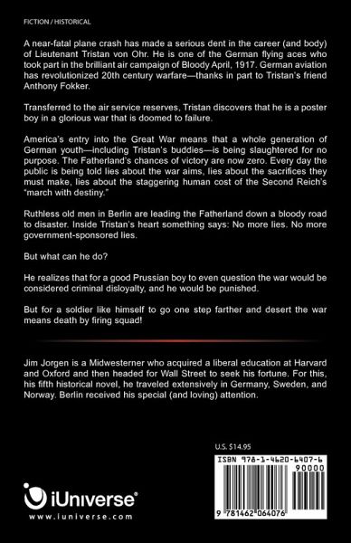 A near-fatal plane crash has made a serious dent in the career (and body) of Lieutenant Tristan von Ohr. He is one of the German fl ying aces who took part in the brilliant air campaign of Bloody April, 1917. German aviation has revolutionized 20th century warfare-thanks in part to Tristan's friend Anthony Fokker. Transferred to the air service reserves, Tristan discovers that he is a poster boy in a glorious war that is doomed to failure. America's entry into the Great War means that a whole generation of German youth-including Tristan's buddies-is being slaughtered for no purpose. The Fatherland's chances of victory are now zero. Every day the public is being told lies about the war aims, lies about the sacrifices they must make, lies about the staggering human cost of the Second Reich's "march with destiny." Ruthless old men in Berlin are leading the Fatherland down a bloody road to disaster. Inside Tristan's heart something says: No more lies. No more government-sponsored lies. But what can he do? He realizes that for a good Prussian boy to even question the war would be considered criminal disloyalty, and he would be punished. But for a soldier like himself to go one step farther and desert the war means death by fi ring squad!