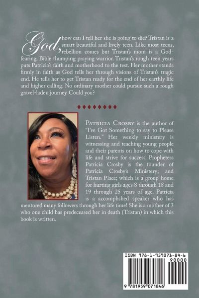 God, how can I tell her she is going to die? Tristan is a smart beautiful and lively teen. Like most teens, rebellion comes but Tristan's mom is a God-fearing, Bible thumping praying warrior. Tristan's rough teen years puts Patricia's faith and motherhood to the test. Her mother stands firmly in faith as God tells her through visions of Tristan's tragic end. He tells her to get Tristan ready for the end of her earthly life and higher calling. No ordinary mother could pursue such a rough gravel-laden journey. Could you?