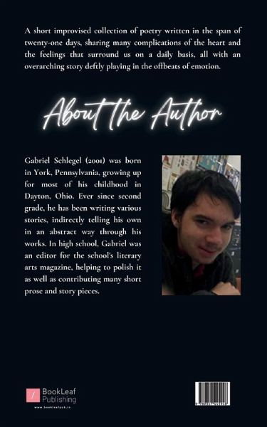 Gabriel Schlegel (2001) was born in York, Pennsylvania, growing up for most of his childhood in Dayton, Ohio. Ever since second grade, he has been writing various stories, indirectly telling his own in an abstract way through his works. In high school, Gabriel was an editor for the school's literary arts magazine, helping to polish it as well as contributing many short prose and story pieces.