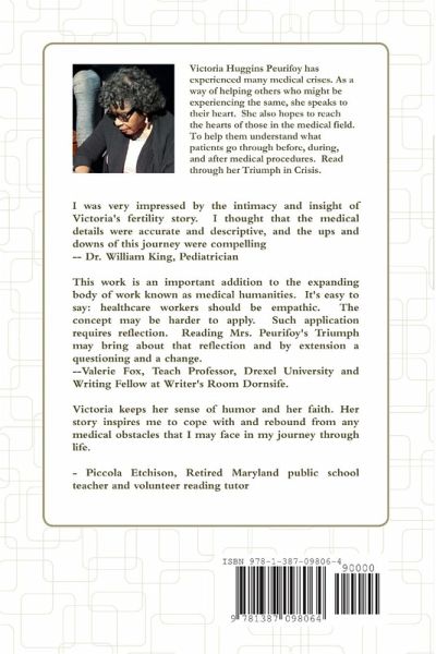 What does resilience look like? Triumph in Crisis describes it for us. Victoria keeps her sense of humor and her faith. The medical details are accurate and descriptive, and the up's and downs of this journey are compelling. This book, Triumph in Crisis, is not just an appropriate title; it is a look into the author's world of medical turmoil and her victories where she gives all glory to God and rightfully so. The author also takes you by the hand and shows you how the medical personnel does and sometimes does not demonstrate compassion for the patient. She explains some medical procedures, exhibits much candor and shares why she had concerns about them. This work is an important addition to the expanding body of work known as medical humanities. It's easy to say: health care workers should be empathetic. The concept may be harder to apply. Such application requires reflection. Reading Triumph in Crisis may bring about that reflection and by extension, a question and a change
