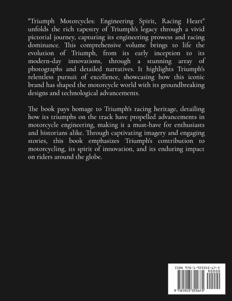 "Triumph Motorcycles: Engineering Spirit, Racing Heart" unfolds the rich tapestry of Triumph's legacy through a vivid pictorial journey, capturing its engineering prowess and racing dominance. This comprehensive volume brings to life the evolution of Triumph, from its early inception to its modern-day innovations, through a stunning array of photographs and detailed narratives. It highlights Triumph's relentless pursuit of excellence, showcasing how this iconic brand has shaped the motorcycle world with its groundbreaking designs and technological advancements. The book pays homage to Triumph's racing heritage, detailing how its triumphs on the track have propelled advancements in motorcycle engineering, making it a must-have for enthusiasts and historians alike. Through captivating imagery and engaging stories, this book emphasizes Triumph's contribution to motorcycling, its spirit of innovation, and its enduring impact on riders around the globe.