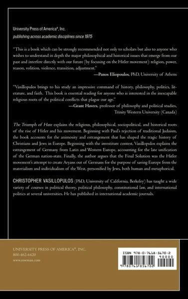 The Triumph of Hate explains the religious, philosophical, sociopolitical, and historical roots of the rise of Hitler and his movement. Beginning with Paul's rejection of traditional Judaism, the book accounts for the animosity and estrangement that has shaped the tragic history of Christians and Jews in Europe. Beginning with the investiture contest, Vasillopulos explains the estrangement of Germany from Latin and Western Europe, accounting for the late unification of the German nation-state. Finally, the author argues that the Final Solution was the Hitler movement's attempt to create Aryans out of Germans for the purpose of saving Europe from the materialism and individualism of the West, personified by Jews, both human and metaphorical.