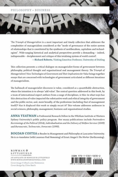 This collection presents a critical dialogue on managerialist forms of government between philosophy, political thought, organisational and management theory. The volume brings together essays that are concerned with technologies of government that are articulated as different iterations of managerialism. The hallmark of managerialist discourse is value, considered as a quantifiable abstraction, where the intention is to always 'add value'. The central question addressed here by a team of international expert authors from across a range of disciplines is this: in what ways has this abstraction of value impacted on the substantive work and ethical integrity of government and the public sector, and, more broadly, of the professions (including that of management itself)? Has it displaced this work, or simply recast it? The volume addresses audiences in social sciences, philosophy, management, business, and organisational studies.
