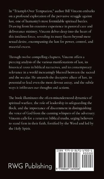 In "Triumph Over Temptation," author Bill Vincent embarks on a profound exploration of the pervasive struggle against lust, one of humanity's most formidable spiritual battles. Drawing from his extensive experience in pastoral care and deliverance ministry, Vincent delves deep into the heart of this insidious force, revealing its many facets beyond mere sexual desire, encompassing the lust for power, control, and material excess. Through twelve compelling chapters, Vincent offers a piercing analysis of the various manifestations of lust, its historical roots in biblical narratives, and its contemporary relevance in a world increasingly blurred between the sacred and the secular. He unravels the deceptive allure of lust, its potential to lead even the most devout astray, and the subtle ways it infiltrates our thoughts and actions. The book illuminates the often-misunderstood dynamics of spiritual warfare, the role of leadership in safeguarding the flock, and the importance of discernment in distinguishing the voice of God from the cunning whispers of the adversary. Vincent calls for a return to biblical truths, urging believers to stand firm in their faith, fortified by the Word and led by the Holy Spirit. "Triumph Over Temptation" is not merely a discourse on the pitfalls of lust; it's a roadmap to liberation, a call to arms against the forces that seek to ensnare us. It's an invitation to embark on a transformative journey, fortified by divine wisdom, to claim victory over the desires that threaten to derail our spiritual walk. Whether you are a long-standing believer or new to the faith, this book is a beacon of light, offering guidance, hope, and the promise of triumph over the trials that test our resolve. Embrace the journey within these pages, and step into the freedom and victory that await.
