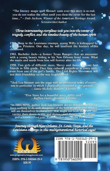 "The literary magic spell Stewart casts over this story is so real, you do not realize the effect until you close the cover for the last time..." - Dale Jackson, Winner of the American Heritage Award, Screenwriter/Author Three interweaving storylines toss you into the center of tragedy, conflict, and the timeless beauty of the human spirit 1903. Deep in the Louisiana swamps, young Willy is kidnapped by a Vodou Priestess. One day, he will confront the horrors of his childhood. 1903. Bachelor Jack-a former Texas Ranger-has an encounter with a young beauty hiding in his New Orleans hotel room. What she wants and needs from him will forever alter his life. 1958. Two girls of different races, Mercy and Annie, become best friends in fifth grade. They face cultural prejudices at every turn, even from one of the girl's family. The Civil Rights Movement will test their friendship on the way to adulthood. "Jodi Lea Stewart sets the stage with an emotional series of events, one in particular in which I practically crumpled to the ground..." - Jamie Michele, Readers' Favorite "Five Stars for a beautiful story, deftly told."- Ruffina Oserio, Readers' Favorite "In TRIUMPH, author Jodi Lea Stewart shows that time and place have nothing to do with the power of the human spirit. The readers will see themselves in characters that might not look like them but carries their desire to rise and thrive-and therein lies its power and a lesson..." - Cyrus Webb, Author and Media Personality Journey through New Orleans, St. Louis, Texas, and the Louisiana swamps in this multigenerational historical saga!