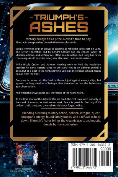 TRIUMPH'S ASHES is a triumph! TOP FIFTY INDIE BOOKS OF 2021 (as chosen by Read Free.ly) "The Artemis War - Volume 4 gives readers a complete package, drama, love, suspense, excitement, heartbreak, danger, blood and humor. All in one book." - Bookish Reviews In the gripping sequel, "Triumph's Ashes," Kendra Cassidy's hopes of ending the war by toppling the Solarian Union have crumbled. Instead, the Union of Artemis has emerged stronger than ever, led by the ruthless Vasilia Newling, who is hell-bent on annihilating the Terran Federation and crushing the rebels on Luna. As Vasilia consolidates power, Kendra faces the shattering reality that her actions have inadvertently fueled a more formidable adversary. The once-united Earth Government now turns against Kendra, pushing her to contemplate fleeing to the stars with her family. However, the call to duty and the desperate plea from her allies force Kendra to remain on Earth, where a firestorm threatens everyone she holds dear. Now, with plots, counterplots, espionage, and treachery unfolding, Kendra, supported by her fellow dreamers, must navigate a complex web of personal courage and sacrifice to resist the impending doom brought by the Union. In "Triumph's Ashes," readers are taken on a rollercoaster of political intrigue and personal struggle as Kendra and the Terran Federation battle against the relentless Union of Artemis. The narrative weaves a tale of loyalty, betrayal, and the high stakes of war, exploring the difficult choices Kendra must make to protect her loved ones. As both sides grapple with the inevitability of sacrifices for victory, the story unfolds against a backdrop of tension, making it clear that the price of triumph may be higher than anyone could have imagined. Will Kendra's resilience and the courage of her allies be enough to tip the scales, or will the cost of victory be too great for them to bear? "Triumph's Ashes" is a riveting exploration of the complexities of war, friendship, and the indomitable spirit of those who dare to resist. "Sometimes, winning is harder than losing, as our intrepid heroines are finding out in Adam Gaffen's latest installment proves. Without spoiling anything, revolution is hard, bloody and when you are fighting a psychopathic whackjob, for your ohana... winning can feel very much like losing." "Adam does an amazing job continuing the Cassidy Chronicles with this one... there's action, adventure, romance, and some heartbreak too... it's a definite page-turner, and I couldn't put it down!" " His well defined characters and compelling dialogue drove the plot forward, and once I had discovered the basic gist of the story I was drawn into it with a degree of comfort and familiarity."