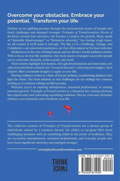 Embark on an uplifting a journey through the compelling and motivational stories of people, just like you, who have encountered difficulty and emerged to flourish, rather than fold in the face of challenge. Many people talk about "desirable disadvantages" or "formative adversity," yet in the midst of hard things, before we receive the learning and insight, we all inevitably wonder how and if we'll make it through. The Big 3 C's (Challenge, Change, and Complexity) are the very fabric of every human experience, yet when these moments show up in our lives, they are often the exact opposite experiences we wish to encounter. We are all resilient. Resilience is the essence of being human. We all also have resilience stories. Yet, the resilience stories that are our superpower, our defining moments that have led to triumph and transformation, often remain hidden, untold, until now! The inspiring stories of the curated authors in this book, Triumphs of Transformation: Stories of Resilience, think Chicken Soup for the Soul meets real life stories of resilience, reveals the strategies and principles that successful people have employed to overcome obstacles, achieve their goals, and excel in their personal and professional lives. Learn about the unwavering determination and innovative approaches that enabled these leaders to emerge stronger than before. From overcoming personal hardships to navigating complex business landscapes, their stories will empower you to embrace change, cultivate resilience, and pursue your aspirations with renewed vigor. Discover how these remarkable people harnessed the power of resilience not just to recover from setbacks but to "bounce forward," propelling themselves to new heights, despite the challenges they faced. Each chapter offers invaluable insights and actionable advice, showing you how to apply these lessons to your own life. Through the courageous willingness to demonstrate immense vulnerability and authenticity, there is an even more powerful of lesson: Sharing our resilience stories with one another is the greatest form of human alchemy. When we retell our stories of the Big 3 C's, after healing and reflection, we effectively transmute the darkest times of our lives into a light that shines out into the world, onto other people's paths, piercing the hopelessness and serving as a signpost of encouragement. The stories in Triumphs of Transformation reminds us that the challenge you have, are, or will face is not the "period" punctuating the end of the sentence of your life, it is the "comma," inviting you to write the next sentence of your existence. These stories of both well-known and every day people remind us, even in our darkest times, that hope is only one story away, we can, in the words of Brene Brown, all be part of one another's survival guides, and that not a single drop of pain or misfortunate is wasted in our formation. Not to mention the reminder that if they made it, you can too! Triumphs of Transformation is more than a book-it's a blueprint for turning adversity into opportunity and for cultivating both a skillset and a mindset of unyielding resilience. Whether you are an aspiring entrepreneur, a seasoned professional, or someone seeking personal growth, this collection will inspire you to achieve the success you desire. Dive into these transformative tales and let them ignite your own journey towards triumph and transformation. Overcome your obstacles. Embrace your potential. Transform your life.