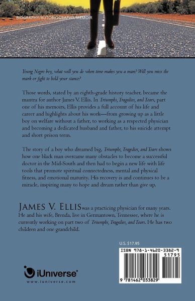 Young Negro boy, what will you do when time makes you a man? Will you miss the mark or fight to hold your stance? Those words, stated by an eighth-grade history teacher, became the mantra for author James V. Ellis. In Triumphs, Tragedies, and Tears, part one of his memoirs, Ellis provides a full account of his life and career and highlights about his work-from growing up as a little boy on welfare without a father, to working as a respected physician and becoming a dedicated husband and father, to his suicide attempt, and short prison term. The story of a boy who dreamed big, Triumphs, Tragedies, and Tears shows how one black man overcame many obstacles to become a successful doctor in the Mid-South and then had to begin a new life with life tools that promote spiritual connectedness, mental and physical fitness, and emotional maturity. His recovery is and continues to be a miracle, inspiring many to hope and dream rather than give up.