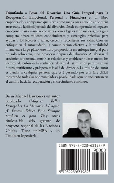 Triunfando a Pesar del Divorcio Una Guía Integral para la Recuperación Emocional, Personal y Financiera, es un libro empoderado y compasivo que sirve como mapa para aquellos que están atravesando la difícil jornada del divorcio. Desde comprender el impacto emocional hasta manejar consideraciones legales y financieras, esta guía completa ofrece valiosos conocimientos y estrategias prácticas para ayudar a los lectores a sanar, crecer y reconstruir sus vidas. Con un enfoque en el autocuidado, la comunicación efectiva y la estabilidad financiera a largo plazo, este libro proporciona un enfoque integral para no solo sobrevivir, sino prosperar después del divorcio. Al abrazar el crecimiento personal, nutrir las relaciones y establecer nuevas metas, los lectores descubrirán la resiliencia dentro de sí mismos para crear un futuro gratificante y próspero más allá del divorcio. La misión del autor es ayudar a cualquier persona que esté pasando por esta fase difícil mostrando todas las oportunidades y posibilidades que se encuentran en el camino hacia la recuperación y el crecimiento continuo.