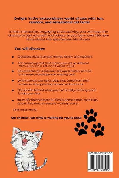 Delight in the extraordinary world of cats with fun, random, and sensational cat facts! Do you have a cat, want a cat, or know someone who can't get enough of cats? You can now get your paws on round 2 of Trivia For Kids Who Love Cats. In this interactive, engaging trivia activity, you will have the chance to test yourself and others as you learn over 150 new facts about the spectacular life of cats. Get excited-more cat trivia is waiting for you to play! You will discover: Quotable trivia to amaze friends, family, and teachers The surprising trait that marks your cat as different from every other cat in the whole world Educational vocabulary, biology & history primed to increase knowledge and reading level Wild instincts cats have today that come from their ancestors' days prowling deserts and savannas The secrets behind what your cat is really thinking when it licks your face Hours of entertainment for family game nights, road trips, screen-free time, or doctors' waiting rooms And much more! Appropriate for kids (and for reading out loud at storytime!), big kids, and anyone who is a kid at heart. Whether a gift for a birthday or a group activity for holiday events, trivia is a PAWS-itive joy for cat lovers. If you are or have a smart and curious kid who loves cats, get this purr-fect gift!