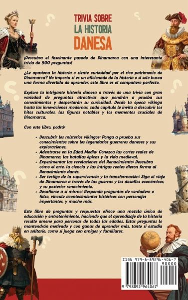 ¡Descubra el fascinante pasado de Dinamarca con una interesante trivia de 500 preguntas!¿Le apasiona la historia o siente curiosidad por el rico patrimonio de Dinamarca? No importa si es un aficionado de la historia o si solo busca una forma divertida de aprender, este libro es el compañero perfecto.Explore la intrigante historia danesa a través de una trivia con gran variedad de preguntas atractivas que pondrán a prueba sus conocimientos y despertarán su curiosidad. Desde la época vikinga hasta las innovaciones modernas, cada capítulo le invita a descubrir los hitos culturales, las figuras notables y los momentos cruciales de Dinamarca.Con este libro, podrá:Descubrir los misterios vikingos: Ponga a prueba sus conocimientos sobre los legendarios guerreros daneses y sus exploraciones. Adentrarse en la Edad Media: Conozca las cortes reales de Dinamarca, las batallas épicas y la vida medieval. Experimentar las revelaciones del Renacimiento: Descubra cómo el arte, la ciencia y las intrigas reales dieron forma al Renacimiento danés. Ser testigo de la supervivencia y la transformación: Siga el viaje de Dinamarca a través de las guerras y los desafíos económicos, y su posterior renacimiento. Desafiarse a sí mismo: Responda preguntas de verdadero o falso, vincule acontecimientos históricos con personajes importantes, y mucho más. Este libro de preguntas y respuestas ofrece una mezcla única de educación y entretenimiento, haciendo que el aprendizaje de la historia resulte ameno para personas de todas las edades. Estas preguntas lo mantendrán motivado y con ganas de aprender más, tanto si estudia en solitario, como si juega con amigos y familiares.