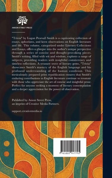 "Trivia" by Logan Pearsall Smith is a captivating collection of essays, aphorisms, and keen observations on English literature and life. This volume, categorized under Literary Collections and Essays, offers a glimpse into the author's unique perspective through a series of concise and thought-provoking pieces. Smith's writing, filled with wit and wisdom, explores a range of subjects, providing readers with insightful commentary and timeless reflections. A treasure trove of literary gems, "Trivia" showcases Smith's mastery of the English language and his profound understanding of the human condition. This meticulously prepared print republication ensures that Smith's enduring contributions to English literature continue to resonate with those who appreciate the art of concise and insightful prose. Perfect for anyone seeking a moment of literary contemplation and a deeper appreciation for the power of observation. This work has been selected by scholars as being culturally important, and is part of the knowledge base of civilization as we know it. This work is in the public domain in the United States of America, and possibly other nations. Within the United States, you may freely copy and distribute this work, as no entity (individual or corporate) has a copyright on the body of the work. Scholars believe, and we concur, that this work is important enough to be preserved, reproduced, and made generally available to the public. We appreciate your support of the preservation process, and thank you for being an important part of keeping this knowledge alive and relevant.