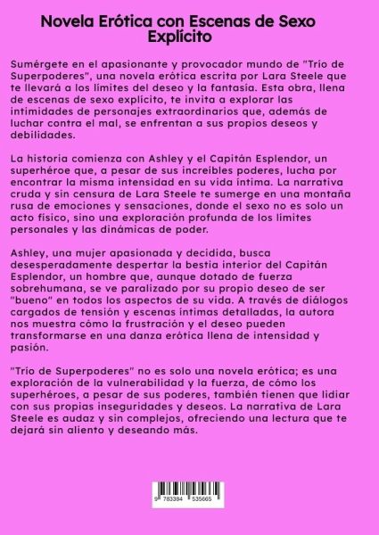 Sumérgete en el apasionante y provocador mundo de "Trío de Superpoderes", una novela erótica escrita por Lara Steele que te llevará a los límites del deseo y la fantasía. Esta obra, llena de escenas de sexo explícito, te invita a explorar las intimidades de personajes extraordinarios que, además de luchar contra el mal, se enfrentan a sus propios deseos y debilidades.La historia comienza con Ashley y el Capitán Esplendor, un superhéroe que, a pesar de sus increíbles poderes, lucha por encontrar la misma intensidad en su vida íntima. La narrativa cruda y sin censura de Lara Steele te sumerge en una montaña rusa de emociones y sensaciones, donde el sexo no es solo un acto físico, sino una exploración profunda de los límites personales y las dinámicas de poder.Ashley, una mujer apasionada y decidida, busca desesperadamente despertar la bestia interior del Capitán Esplendor, un hombre que, aunque dotado de fuerza sobrehumana, se ve paralizado por su propio deseo de ser "bueno" en todos los aspectos de su vida. A través de diálogos cargados de tensión y escenas íntimas detalladas, la autora nos muestra cómo la frustración y el deseo pueden transformarse en una danza erótica llena de intensidad y pasión."Trío de Superpoderes" no es solo una novela erótica; es una exploración de la vulnerabilidad y la fuerza, de cómo los superhéroes, a pesar de sus poderes, también tienen que lidiar con sus propias inseguridades y deseos. La narrativa de Lara Steele es audaz y sin complejos, ofreciendo una lectura que te dejará sin aliento y deseando más.Si buscas una lectura que combine la emoción de las aventuras superheroicas con la intensidad de las relaciones íntimas, "Trío de Superpoderes" es la elección perfecta. Déjate llevar por esta historia llena de pasión, deseo y descubrimiento personal, y descubre cómo los límites del placer pueden ser tan infinitos como los poderes de un superhéroe.