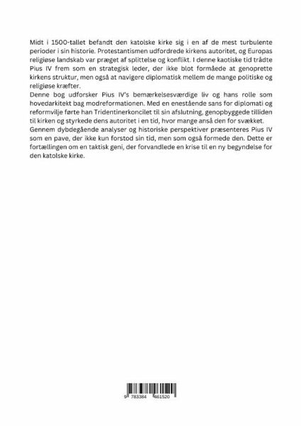 Midt i 1500-tallet befandt den katolske kirke sig i en af de mest turbulente perioder i sin historie. Protestantismen udfordrede kirkens autoritet, og Europas religiøse landskab var præget af splittelse og konflikt. I denne kaotiske tid trådte Pius IV frem som en strate-gisk leder, der ikke blot formåede at genoprette kirkens struktur, men også at navigere diplomatisk mellem de mange politiske og religiøse kræfter.Denne bog udforsker Pius IV's bemærkelsesværdige liv og hans rolle som hovedarkitekt bag modreformationen. Med en enestående sans for diplomati og reformvilje førte han Tridentinerkoncilet til sin afslutning, genopbyggede tilliden til kirken og styrkede dens autoritet i en tid, hvor mange anså den for svækket.Gennem dybdegående analyser og historiske perspektiver præsenteres Pius IV som en pave, der ikke kun forstod sin tid, men som også formede den. Dette er fortællingen om en taktisk geni, der forvandlede en krise til en ny begyndelse for den katolske kirke.