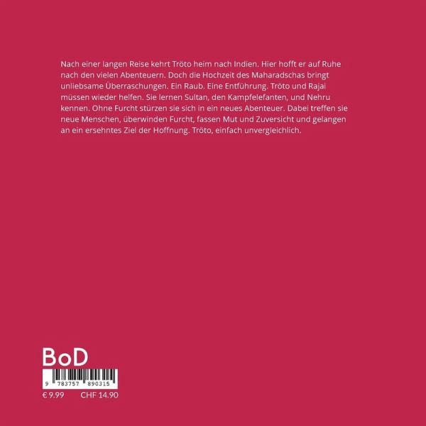 Nach einer langen Reise kehrt Tröto heim nach Indien. Hier hofft er auf Ruhe nach den vielen Abenteuern. Doch die Hochzeit des Maharadschas bringt unliebsame Überraschungen. Ein Raub. Eine Entführung. Tröto und Rajai müssen wieder helfen. Sie lernen Sultan, den Kampfelefanten, und Nehru kennen. Ohne Furcht stürzen sie sich in ein neues Abenteuer. Dabei treffen sie neue Menschen, überwinden Furcht, fassen Mut und Zuversicht und gelangen an ein ersehntes Ziel der Hoffnung. Tröto, einfach unvergleichlich.