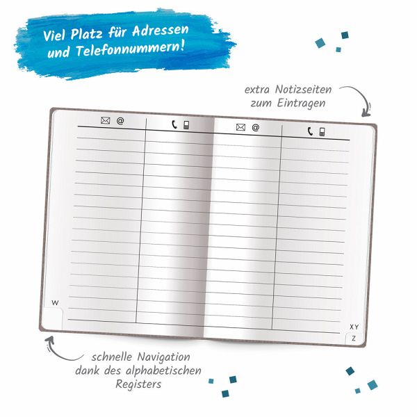 Egal ob auf Reisen oder im Alltag: Dieses handliche Adressbuch im praktischen Format für die Hosentasche bringt mehr Ordnung ins Leben und sorgt dafür, dass alle wichtigen Adressen und Daten zu jeder Zeit griffbereit sind. Das A-Z Register ermöglicht die schnelle Navigation und bietet genug Platz für Einträge zu Familie, Freunden und Arbeitskollegen.